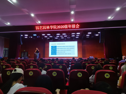 风景园林系主任杜文武副教授、园艺系副主任高启国副教授、本科生2020级班主任和年级全体同学参会。会议由2020级辅导员谭泽轩主持。