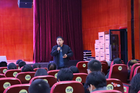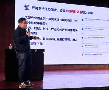 随后,谭泽轩老师以常见的生活实例,深入浅出地点明了当前的就业形势,分别以求职、留学、境内升学、参军入伍、特色就业这五个方面为出发点,聚焦于大三年级职业生涯规划。