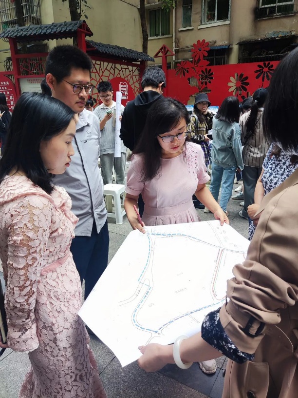 随后,市住建委胡处和中规院王主任耐心回答了同学们的提问。胡处强调,想要诊断出社区目前存在的问题,离不开问需于民,问题找准了,提出的解决策略才是有效的。王主任指出,设计要以人为本,前期要深入地了解人群的需求,才能够做出针对性的改进。接着,同学们跟随设计施工单位负责人踏勘现场,对月亮田片区老旧社区环境进行了初步的了解。在踏勘过程中,张建林老师边走边给同学们指出便于我们进行设计的节点,并举例说明可以在现有的基础上进行怎样的改造,希望同学们能够发挥自己的想象力。陆万香老师针对具体的地点说明了花境的设计要点,指出要根据实际情况来考虑植物配置。