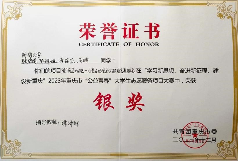 学生项目《“童”筑美好社区——儿童友好型社区建设志愿服务》荣获银奖,这也是学校在今年该项赛事中取得的最好成绩。