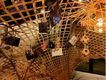 设计理念:空间位于石朝门节点,跨入石门,移步换景。作品以种子为创作主题,用麸皮与谷粒在山城巷营造出千里外的沙漠绿洲景象,隐隐传来的雨声,是各种种子在仙人掌里发出来的异响。200多块种子琥珀藏在场景中,用种子述说场地故事。种子低语,侧耳倾听。