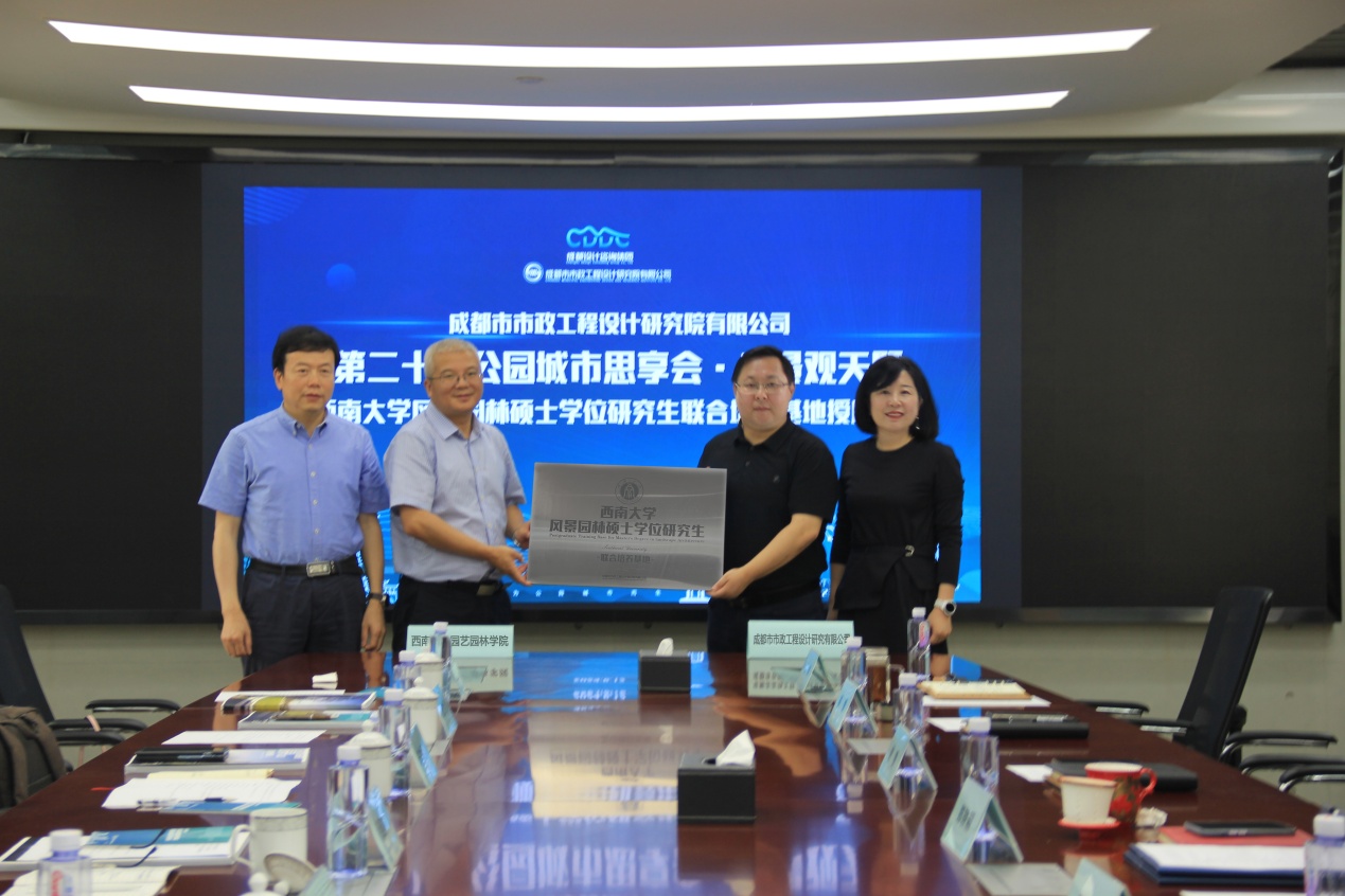 风景园林硕士学位研究生联合培养基地”牌匾。成都市政院党委副书记、董事、副总经理郑轶丽为宋洪元及张建林两位教授颁发“荣誉顾问”聘书。