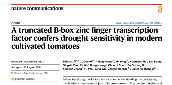 园艺植物发育与逆境生物学创新实验室李金华教授团队联合华中农业大学张俊红教授团队于9月13日在国际知名期刊《Nature Communications》上在线发表了题为“A truncated B-box zinc finger transcription factor confers drought sensitivity in modern cultivated tomatoes”的研究论文。该论文从番茄种质(醋栗PIM,樱桃CER和大番茄BIG)进化上发现了一个抗旱相关的重要SNP,该SNP会导致一个B-box锌指转录因子BBX18的提前终止并影响基因的转录活性。通过调查321份番茄种质资源核苷酸的多样性,发现在该SNP突变在番茄进化过程中是自然突变形成的。不同种番茄资源进行耐旱性分析,发现番茄的抗旱性是和该SNP的突变类型是密切相关的。