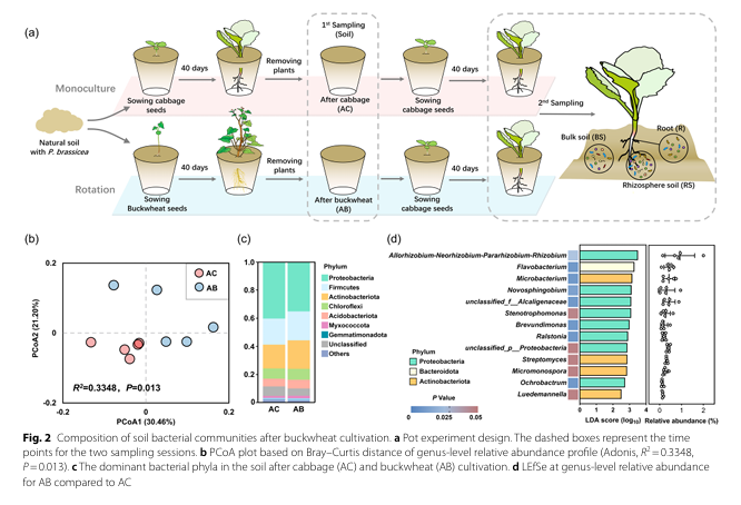 (1)荞麦轮作显著抑制甘蓝根肿病:通过为期三年的田间试验发现,荞麦–甘蓝轮作体系能将根肿病发病率降低67%–97%,且该效果不受病原载量的影响。当对轮作土壤进行高温灭菌处理后,抑病效应随之消失,提示土壤微生物群落是核心驱动因子。