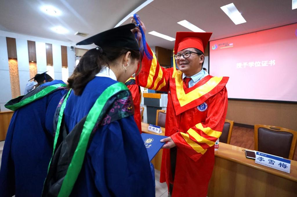 学术委员会委员为毕业生逐一拨穗、颁发学位证书,这一暖心仪式获得了毕业生们的纷纷点赞。