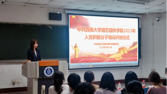 李小红作开班致辞。她介绍了党校开班的目的和培训要求,对新学员提出了要求和希望。一要认真学习,提升素养;二要志存高远,铸牢信念;三要主动参与,学做合一。希望学员们把自己的人生追求同祖国和民族的前途联系起来,树立全心全意为人民服务的思想,带头学好科学文化知识,积极参加学校和院系的各种实践活动。