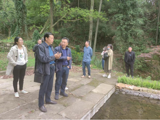党委委员、副院长周建华全程策划景观、绿地改造部分。原石、土墙、青瓦、石桥、溪流、竹林等元素的巧妙融合,娓娓讲述着古老的大院作为造纸厂的历史更迭、在民国时期为抗战做出的重要贡献。廖丹青和周建华为党员同志们详细介绍了传统村落改造的背景和设计理念,党员同志们从专业角度出发对建筑材料选择、设计理念、园林景观构成要素等给予了高度评价。