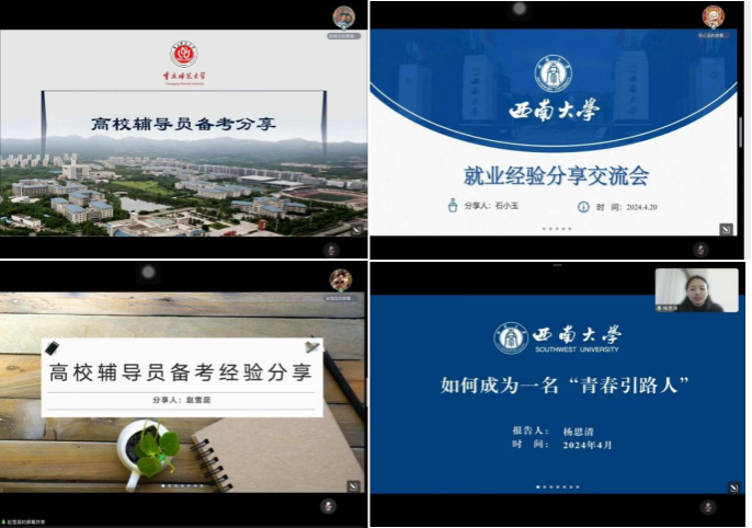 本期活动邀请到四位优秀毕业生榜样为在校生进行经验分享,分别是陈得文,2016级果树学专业研究生、现为重庆师范大学辅导员;石小玉,2020级化学专业研究生、现为日本动漫