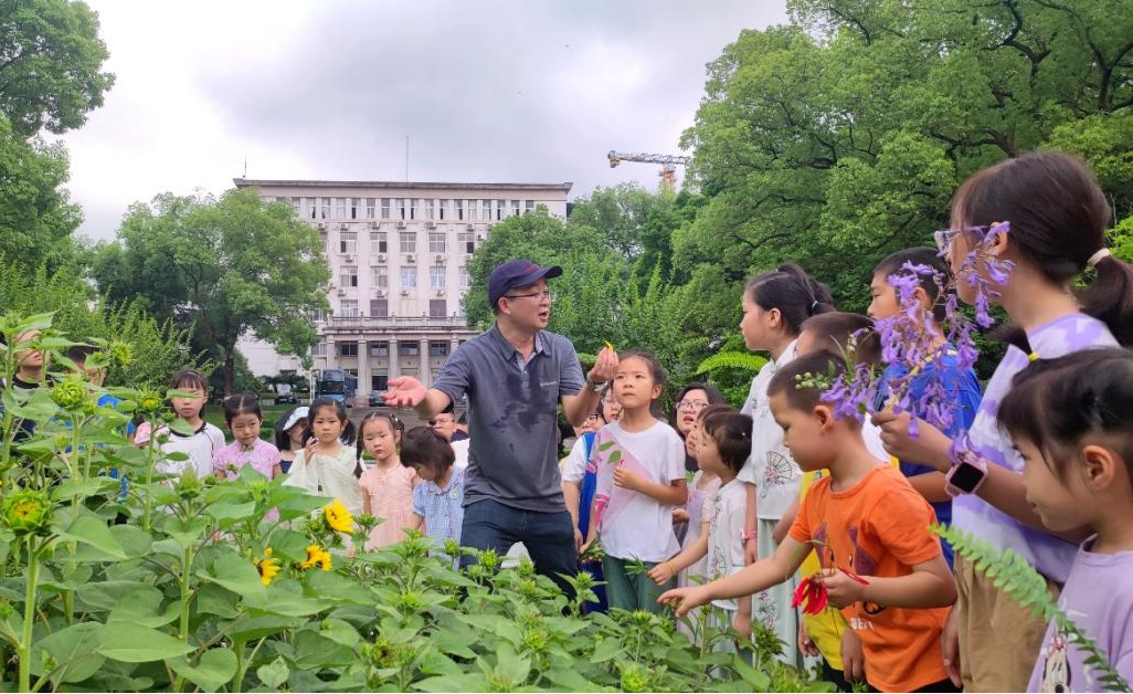 观察架上挂满的紫藤果……在共青团花园,于杰教授向小朋友们讲述了西大校园中常见植物的特征和识别要点,孩子们积极思考,踊跃提问。