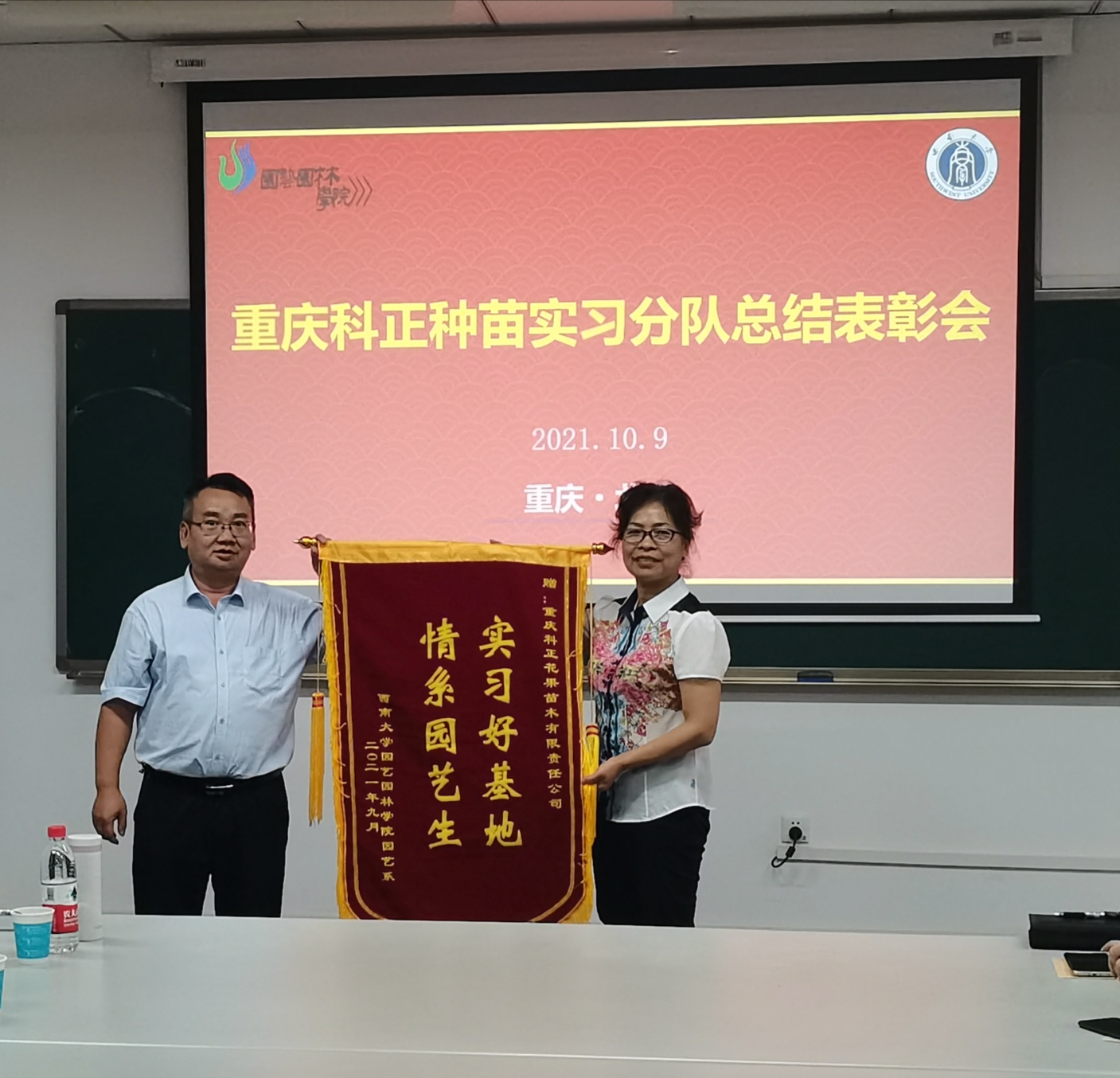 表彰会结束前,科正种苗分别给获得一、二、三等奖的同学颁发了奖金,并给获得一等奖的两位同学颁发了优秀实习生证书,李雪梅书记为重庆科正花果苗木有限责任公司赠送“实习好基地、情系园艺生”的锦旗。