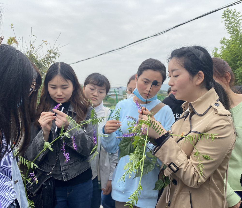 柑橘研究所的研究对象,其花芳香,花、叶、果皮均是提取香精的优质原料……这个是广布野豌豆,豆科野豌豆属的植物,偶数羽状复叶,叶轴顶端为变态的叶卷须,总状花序粉紫色,荚果长圆形……这个是窃衣……”。
