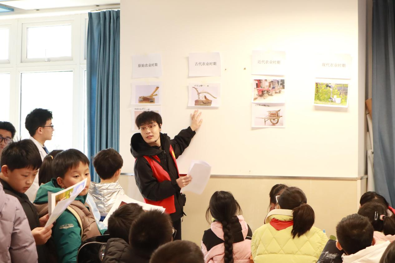 首先是农业知识与乡村振兴初探索环节,实践队成员安翼洲向同学们简短阐述了农业的重要性,由此开启“农业工具的奇妙之旅”。在向同学们讲解了不同时期农业工具的特征和用途后,安翼洲带领同学们参与到农业工具与历史时期匹配的互动游戏当中,激发了同学们的兴趣,加深了他们对于农业工具发展历史的理解,起到了良好的科普作用。