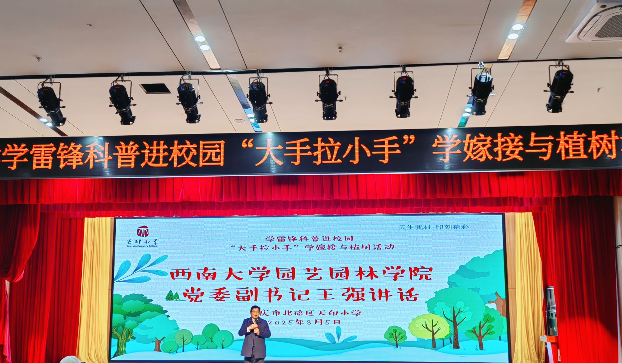 党委副书记王强、园艺本科生党支部书记邓珍珍带领园艺本科生党支部的志愿者们走进北碚区天印小学,开展了以“学雷锋科普进校园,‘大手拉小手’学嫁接”为主题的科技志愿服务活动。