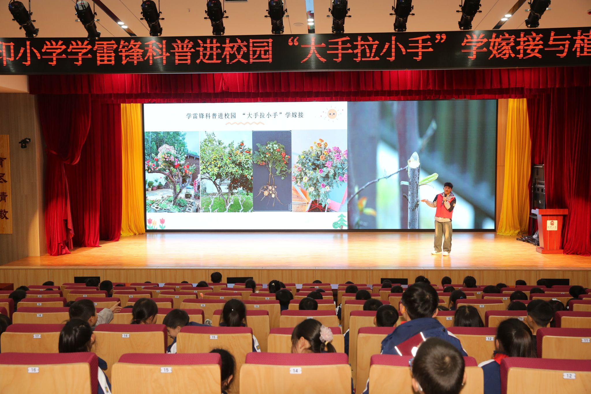 志愿者卢茂林、赵茂伶和尚文俊通过“直播进课堂”的形式为小朋友们带来了一场生动有趣的嫁接小课堂。在报告厅内,小朋友们通过视频直播,一边聆听奇妙的嫁接小知识,一边在镜头下实时观察每一个嫁接步骤。“为什么柠檬和柚子会生长在一棵树上呢?”“为什么要在砧木上切一个小伤口?”......在一问一答的互动中,大手拉小手共同探索嫁接的奥秘。
