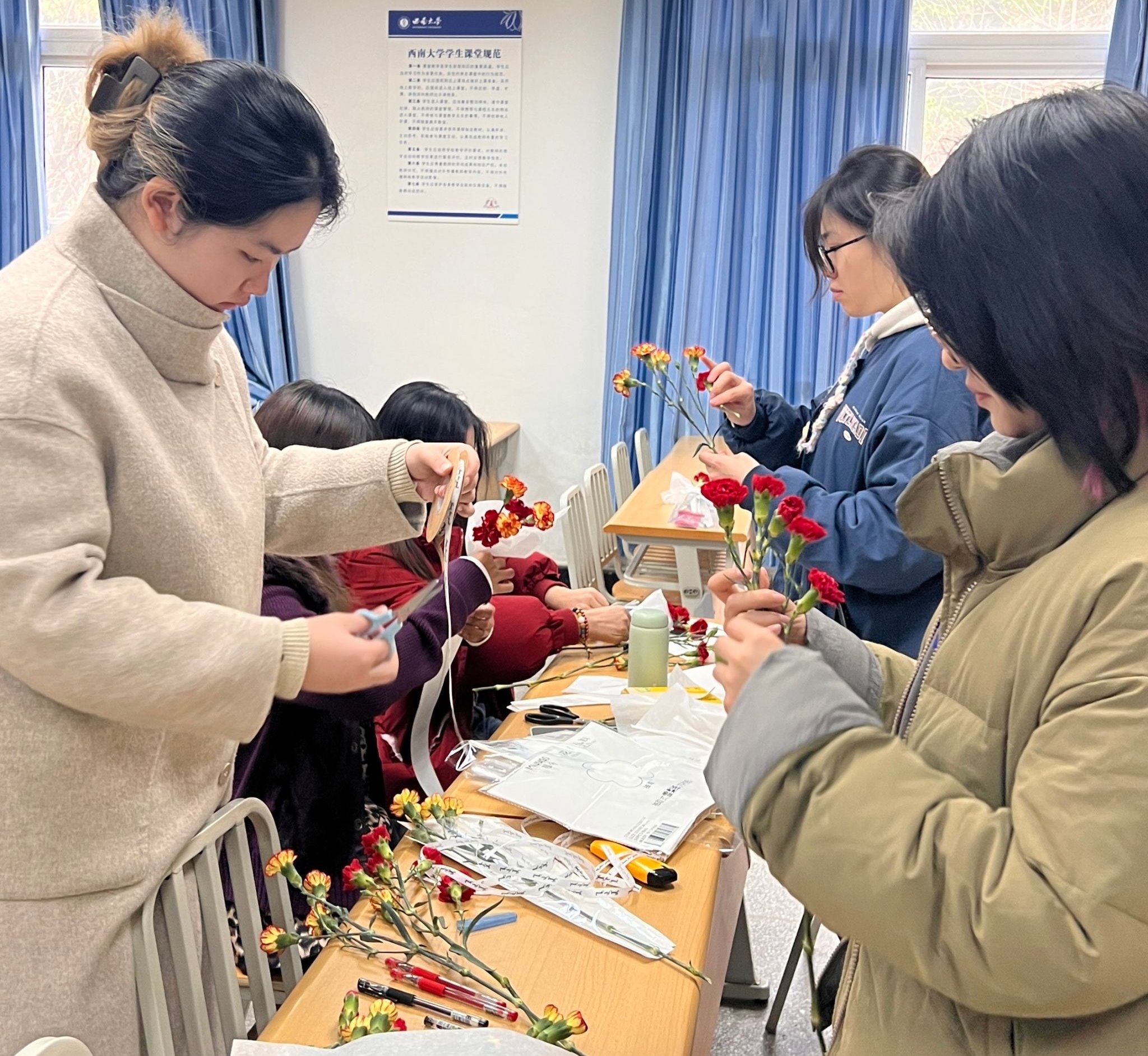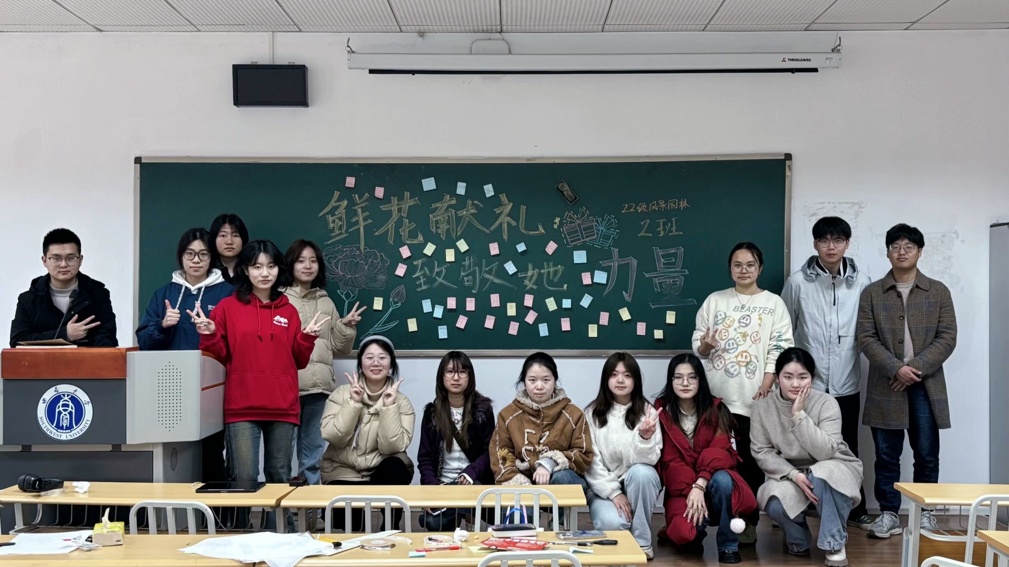 2022级风景园林2班全体同学精心策划了一场以“鲜花献礼,致敬‘她’力量”为主题的特别活动,向学校女性职工送上节日问候,用实际行动诠释感恩与尊重。