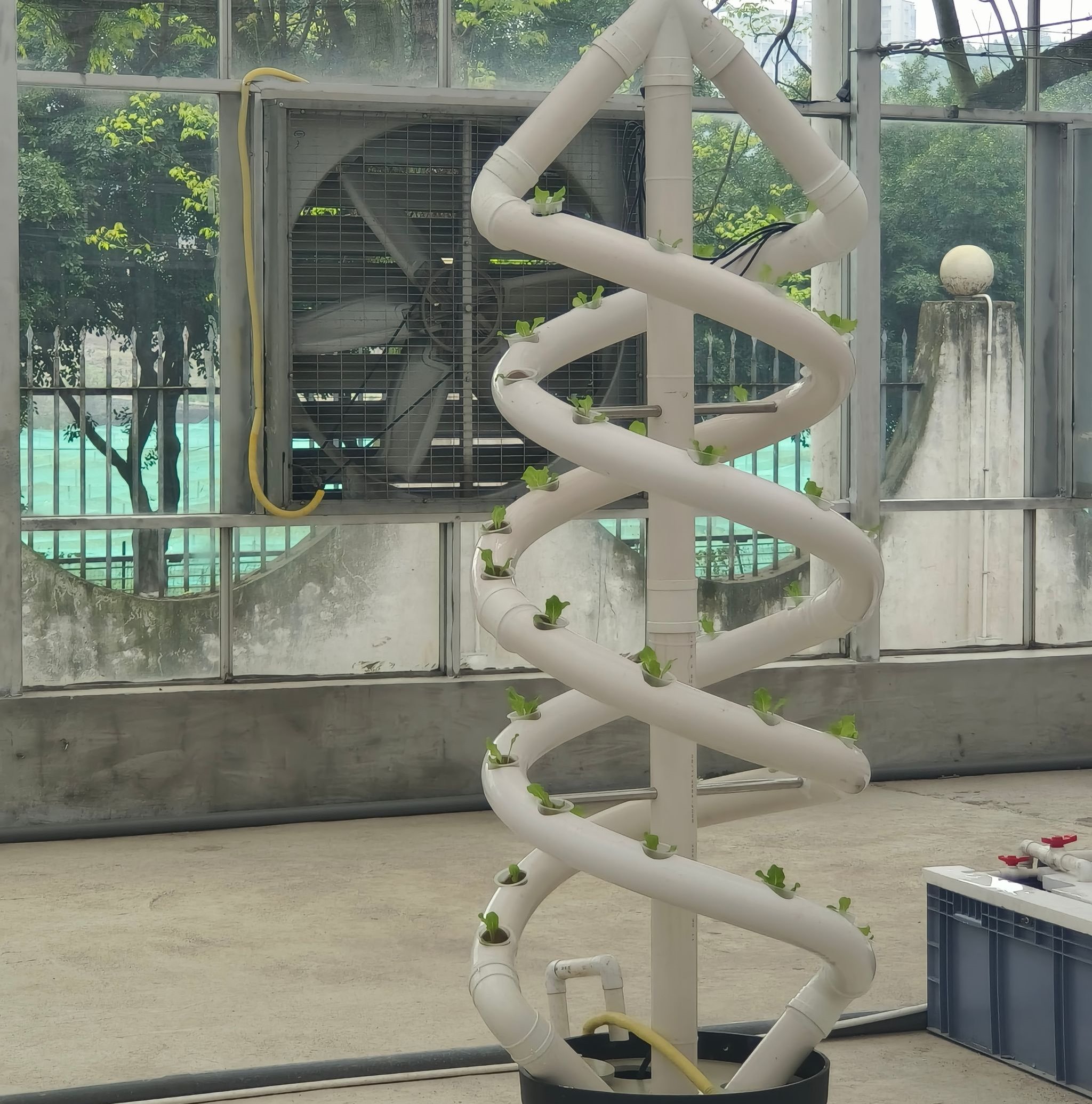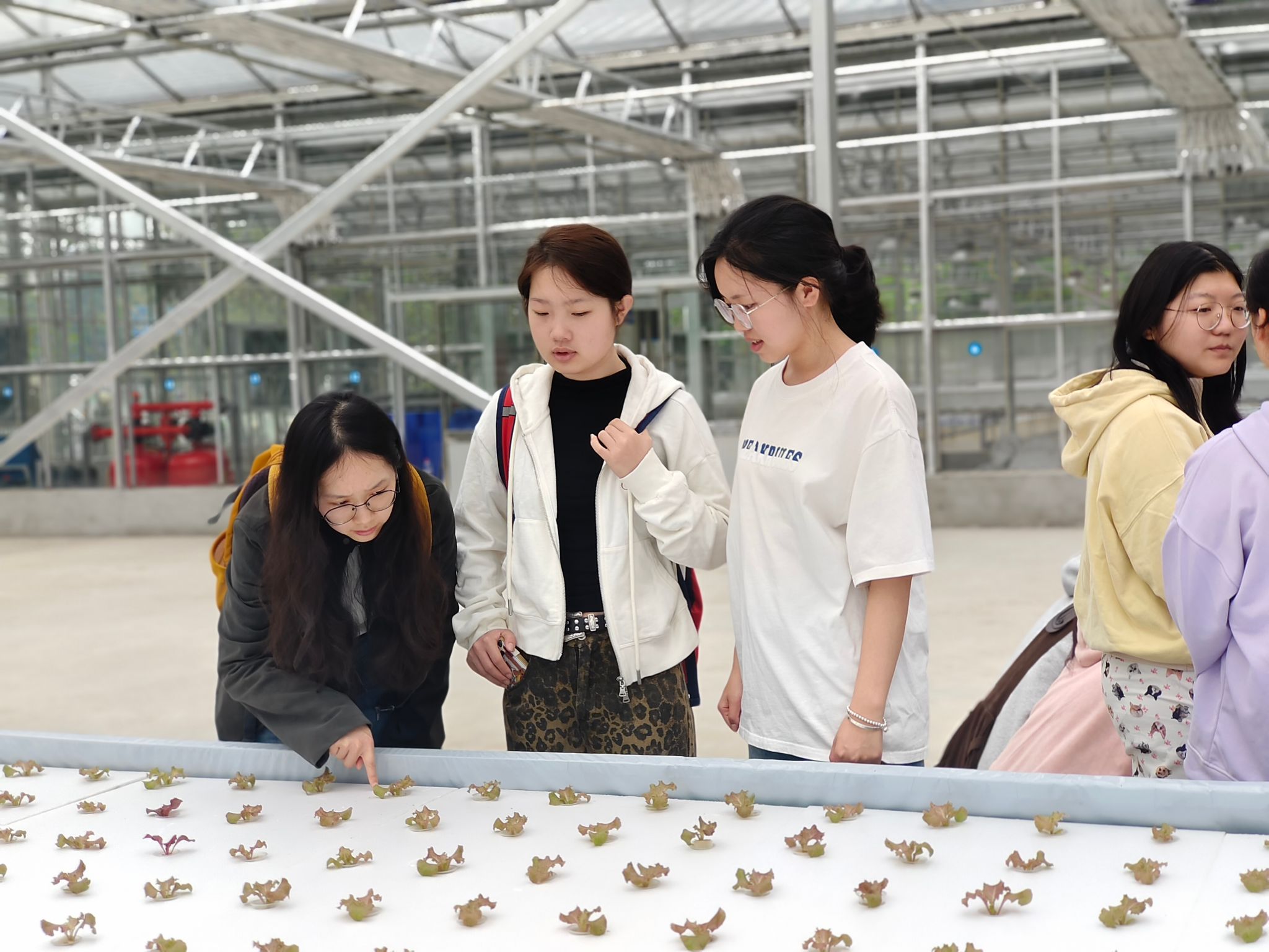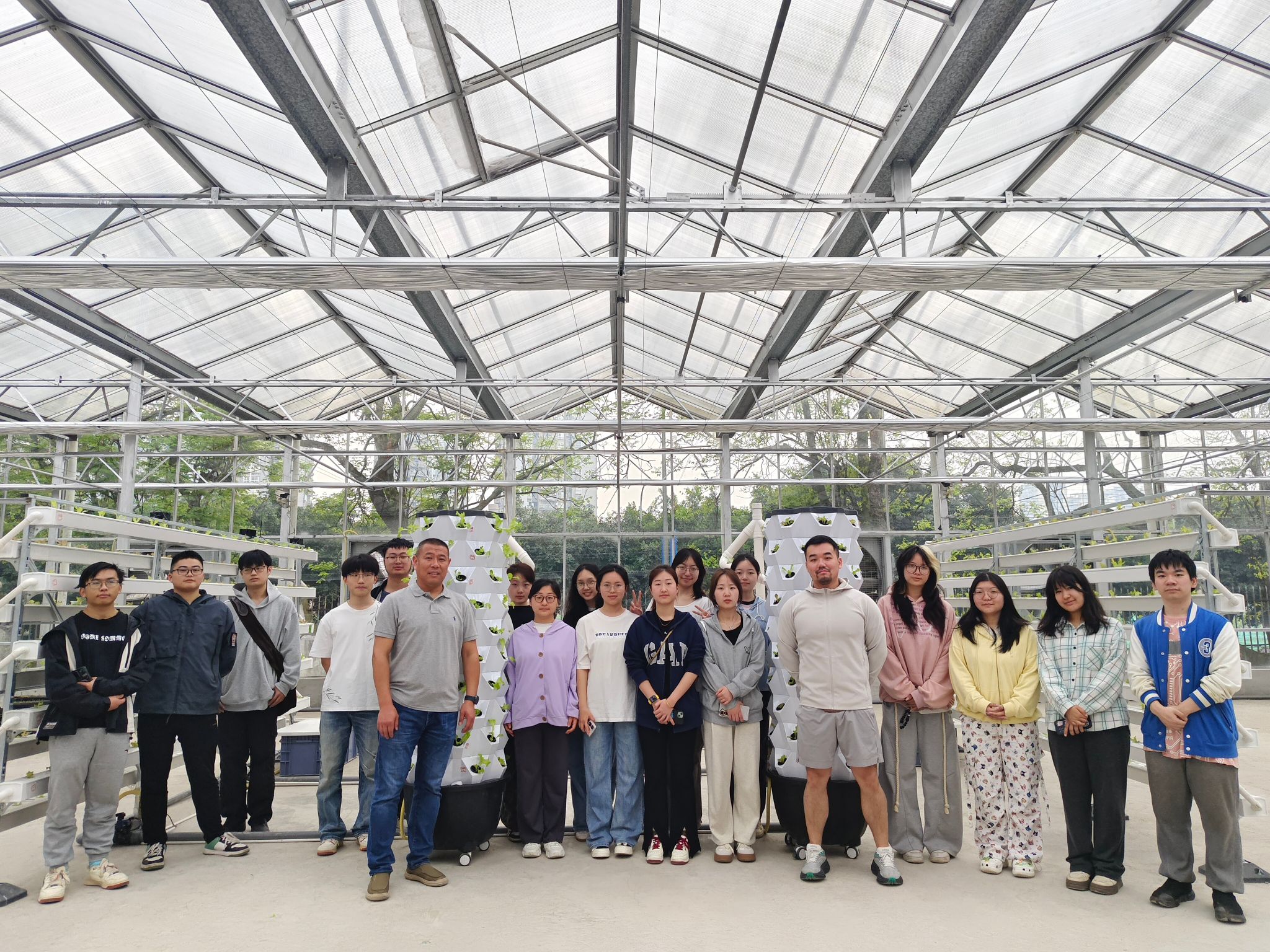步入温室,垂直种植塔与螺旋管道构建的立体种植矩阵首先映入眼帘,宛如一座生机盎然的“绿色摩天大楼”。生菜植株沿着螺旋结构逐级生长,在自动灌溉与营养液循环系统的精准调控下,展现出水培技术的高效魅力。刘海利老师现场讲解道:“这种无土栽培模式不仅能实现营养元素的精准供给,更能缩短作物生长周期,代表着未来都市农业的发展方向。”他特别指出,现代设施农业的清洁性和可控性优势,正在重塑传统农业生产方式。