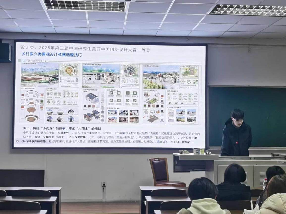 董堃,获国家奖学金、优秀研究生干部、中国研究生美丽中国创新设计大赛一等奖等荣誉。董堃与大家分享了在中规院的实习经历,为同学们选择适合自身情况的实习单位提供了参考。同时,她还结合时代发展趋势,分享了AI在风景园林专业中的辅助作用,通过生动案例展示了AI辅助设计的巨大潜力,使同学们对AI辅助设计的重要意义和具体方法有了更深刻的认识。