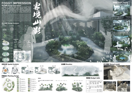 设计理念:浪漫主义诗人李白曾道:“白云映水摇空城。”我们希望再现山城独特的山、水、林、雾于花园中,创造专属重庆人的独家记忆。“雾境山影”是一个象征性花园,以层叠的云雾网塑造出“云雾缭绕”的整体氛围,联系上下空间,同时迂回的路径增加游客的停留时间,以空间塑造时间。抬头,可见蓝天映衬下山城如烟似云的景象;俯首,金属网在地面投射变幻的光影,起伏的云雾空间置放一面镜子,仿佛江面倒映着在雾幔中时隐时现的山城,又犹如看见了另外一个世界,带给人们心灵一份宁静、一点感动和一些领悟。
