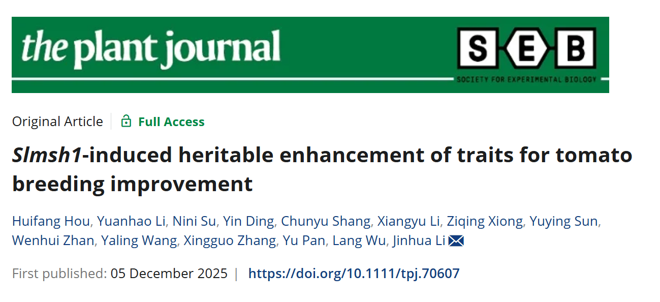 园艺植物发育与逆境生物学创新实验室李金华教授团队于12月5日在The Plant Journal杂志在线发表了题为“Slmsh1-induced heritable enhancement of traits for tomato breeding improvement”的研究论文,揭示了Slmsh1基因编辑介导的可遗传性状增强在番茄育种中的应用。