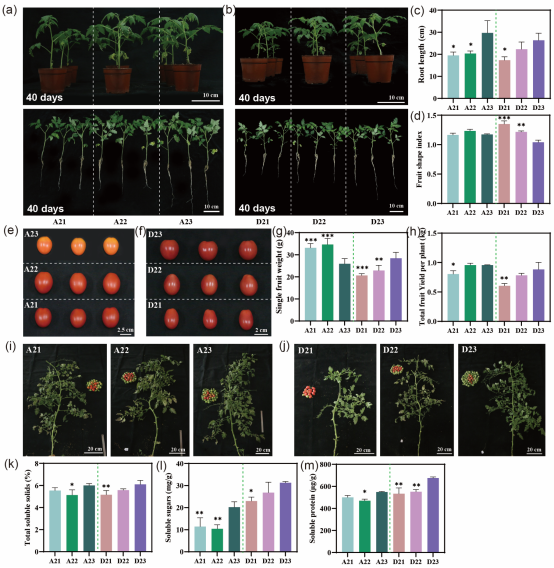 为进一步探索其应用价值,本研究将具有Slmsh1介导的优良自交系进行杂交,评估所获得杂交组合的生长表现、产量及果实品质。田间试验表明,这些杂交后代根系生长更发达,果实产量提高,并且果实中可溶性固形物、可溶性糖和可溶性蛋白含量显著上升。
