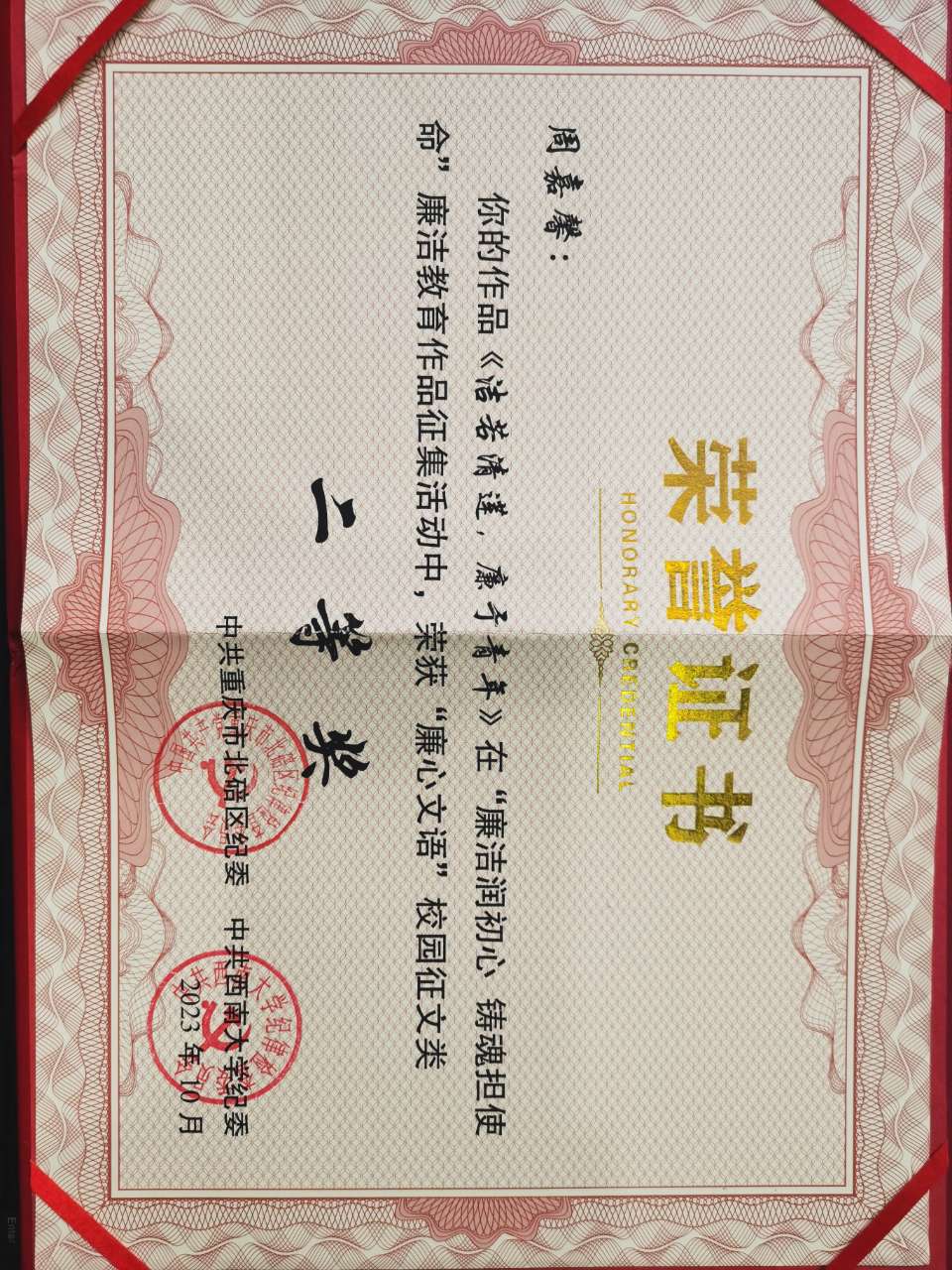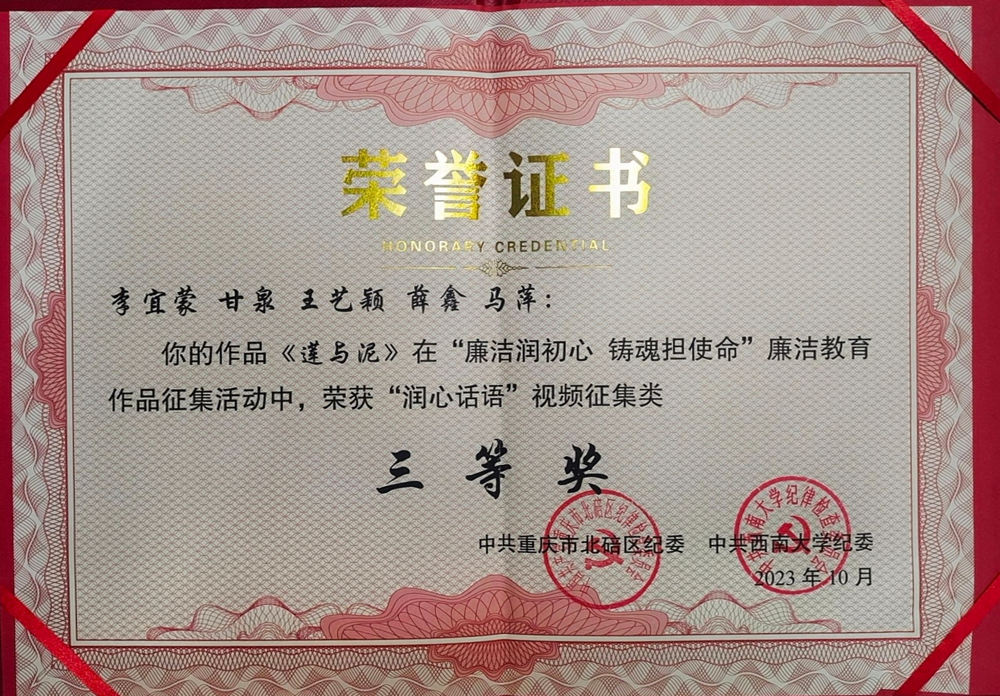纪委高度重视,鼓励师生开展形式多样的廉洁文化创作活动,并选送优秀作品参加征集。最终,周嘉馨作品《洁若清莲,廉于青年》获得“廉心文语”校园征文类二等奖,李宜蒙、甘泉、王艺颖、薛鑫、马萍作品《莲与泥》获得“润心话语”视频征集类三等奖。